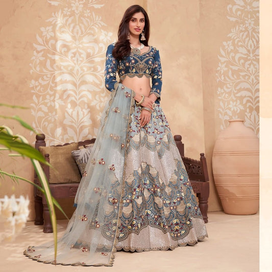 Teal Blue Thread Embroidery Silk Wedding Lehenga Choli