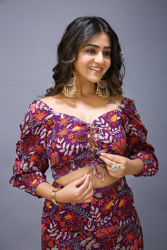 Designer Palazzo Set Hand Embroidered Feather Crop Top