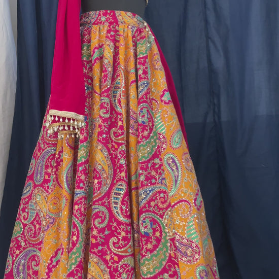 Crafted in rich yellow and green hues, it features intricate mirror work and delicate gota-patti embroidery that captures the joyful spirit of the occasion. The flowy silhouette ensures comfort while you dance, laugh, and celebrate with your loved ones. Paired with a contrast dupatta and minimal jewelry, this look exudes effortless elegance and traditional grace.Â